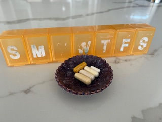 I have a plastic pill container with separate little boxes marked S M T W T F S. I'll bet you know what those letters stand for. Every week I fill each little square with the vitamins, statins, memory boosters, and supplements du jour. Then each morning, with tea so I don’t choke, I move the appropriate (SMTWTF or S) day’s supply to a cute little dish and swallow them.